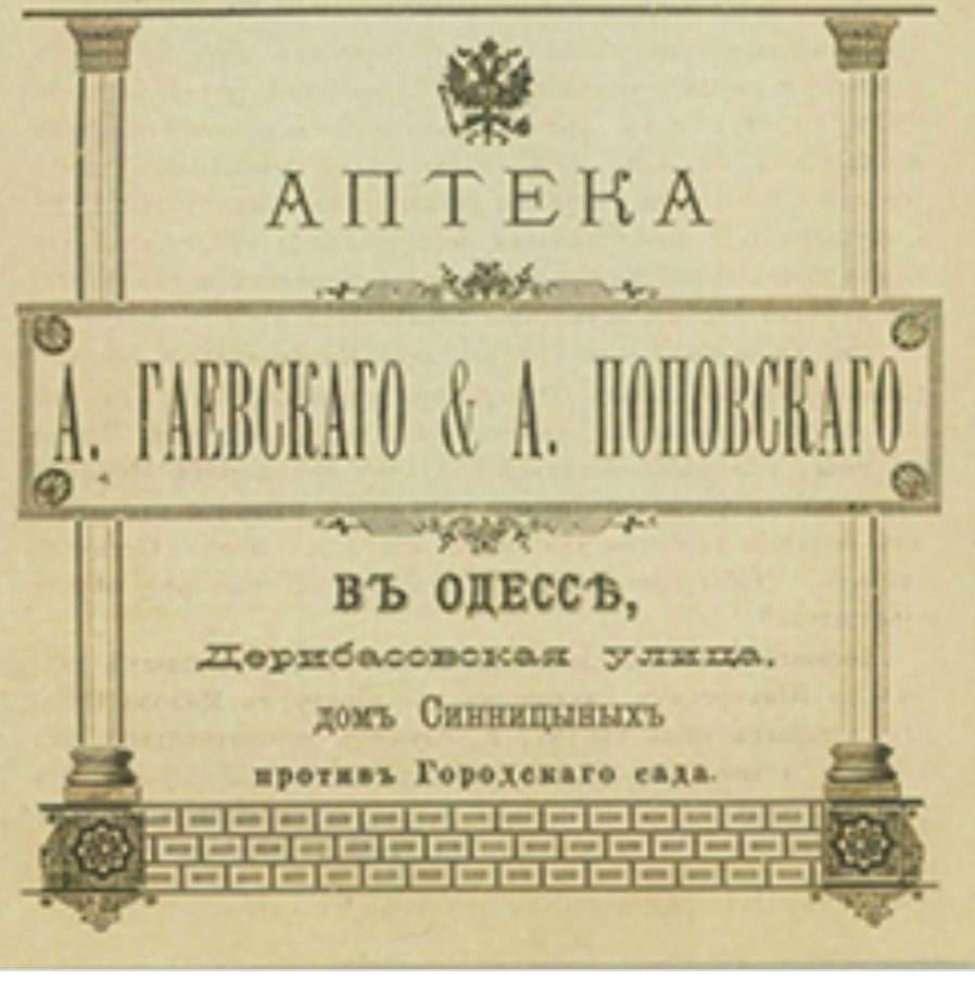 В АКОГ на 1889 году учтено уже 30 аптек, в том числе аптека знаменитого впоследствии А. Гаевского, прописанная по адресу: улица Дерибасовская, 33.