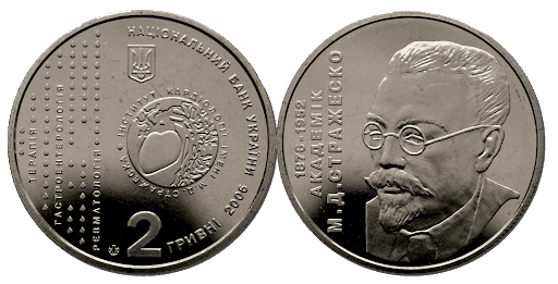 На аверсе монеты изображен малый Государственный герб Украины, сердце с сосудами на фоне круга с надписями «ІНСТИТУТ КАРДІОЛОГІЇ ІМЕНІ М. Д. СТРАЖЕСКА» и «НАЦІОНАЛЬНИЙ БАНК УКРАЇНИ», 2 гривні 2006». В левой части монеты изображена вертикальная композиция, которая состоит из капель и названий разделов медицины. Обратная сторона монеты содержит портрет самого ученого и даты жизни «1876-1952».